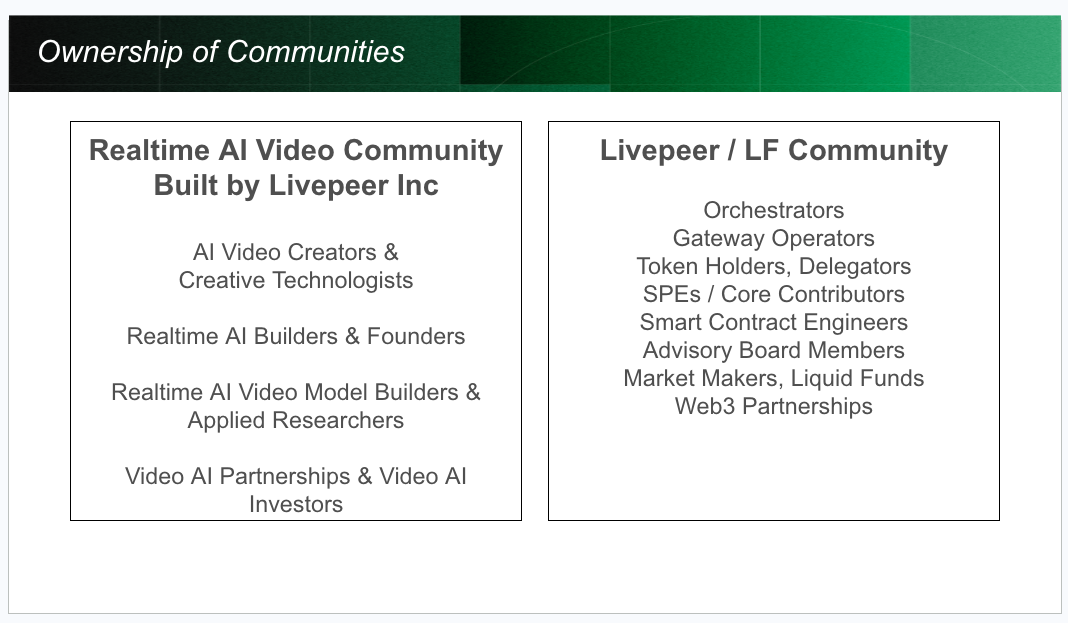 • The Livepeer Foundation will steward the Livepeer community, project marketing, and public goods funding to enable recommendations on the project roadmap.
